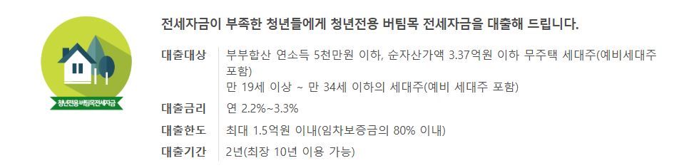 - 청년전용 버팀목전세자금 https://nhuf.molit.go.kr/FP/FP05/FP0502/FP05020301.jsp